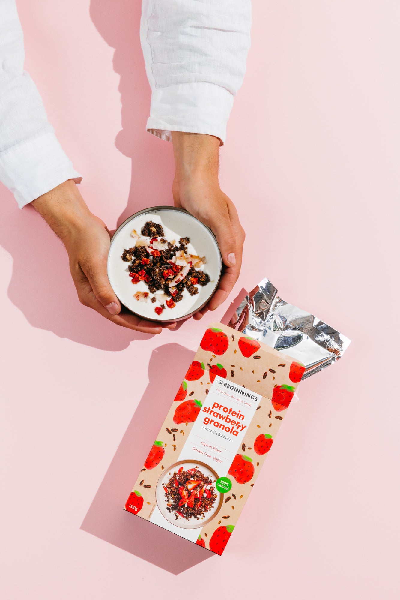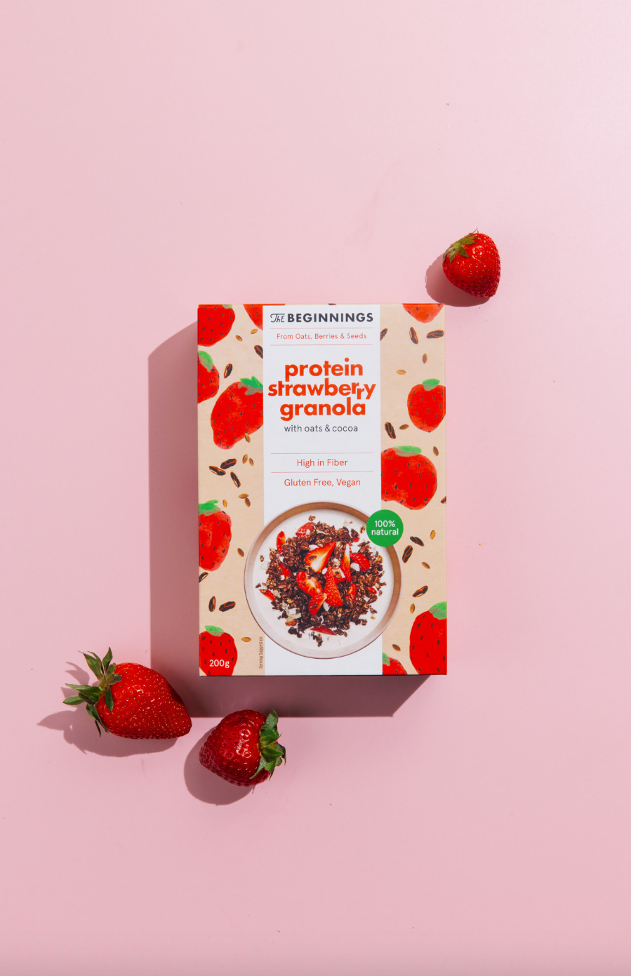 Strawberry Protein Granola- packed with plant-based pea protein, this granola combines gluten-free oats, freeze-dried strawberries, and cocoa, all naturally sweetened with agave syrup. Light yet filling, it's a nutritious option that provides a delicious and convenient way to fuel your day. Perfect for a wholesome breakfast or snack!