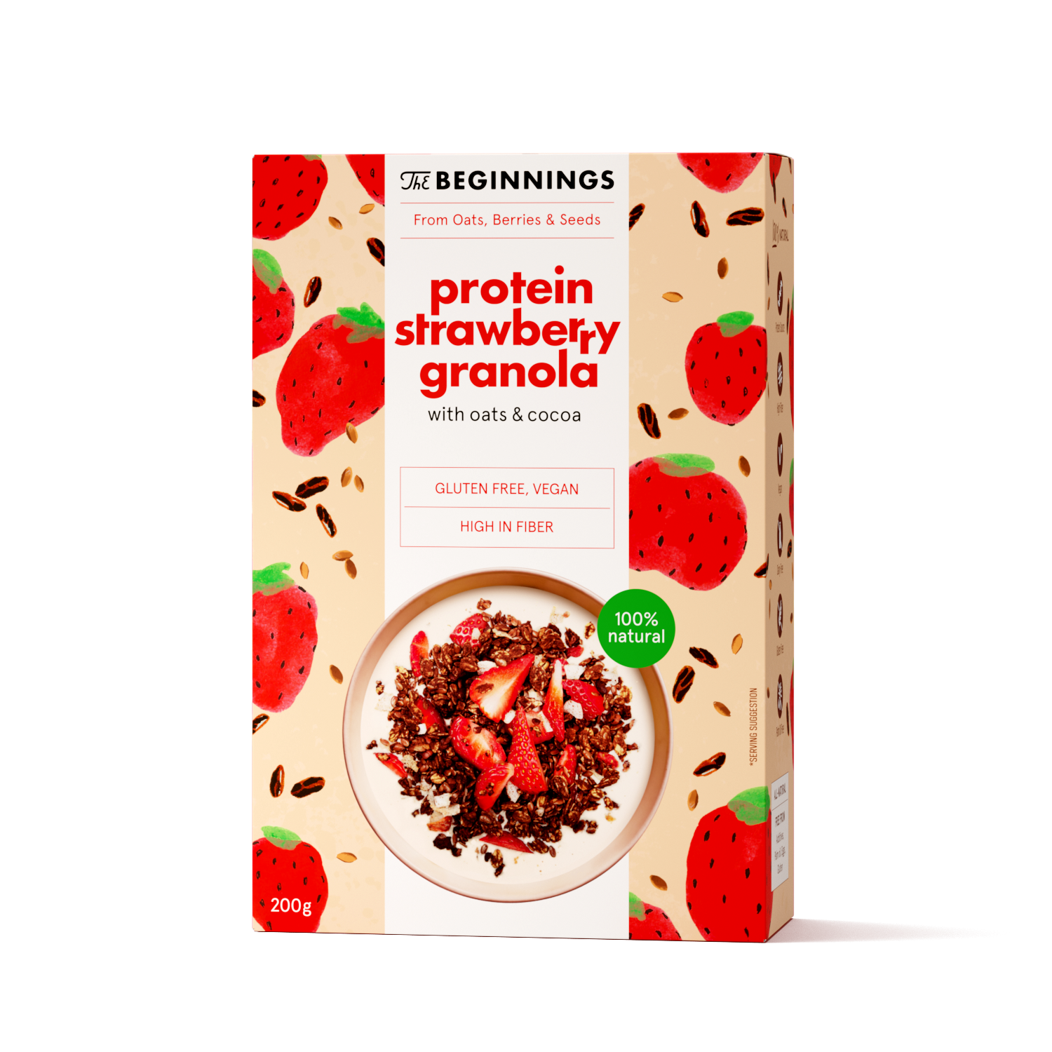 Ingredients: Gluten-free oat flakes (35.8%), agave syrup, flaxseeds, pea protein (6.5%), cocoa powder (4.6%), rapeseed oil, cocoa nibs (4%), coconut chips, freeze-dried strawberries (2%).